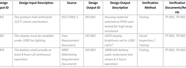 The Design I/O Matrix is another critical tool used in early design phases to ensure traceability between user needs (inputs) and design features (outputs). Unlike QFD, which focuses on requirement translation, the I/O Matrix ensures verification and validation. It supports alignment with Device Master Record (DMR) development and facilitates downstream quality control and auditing.